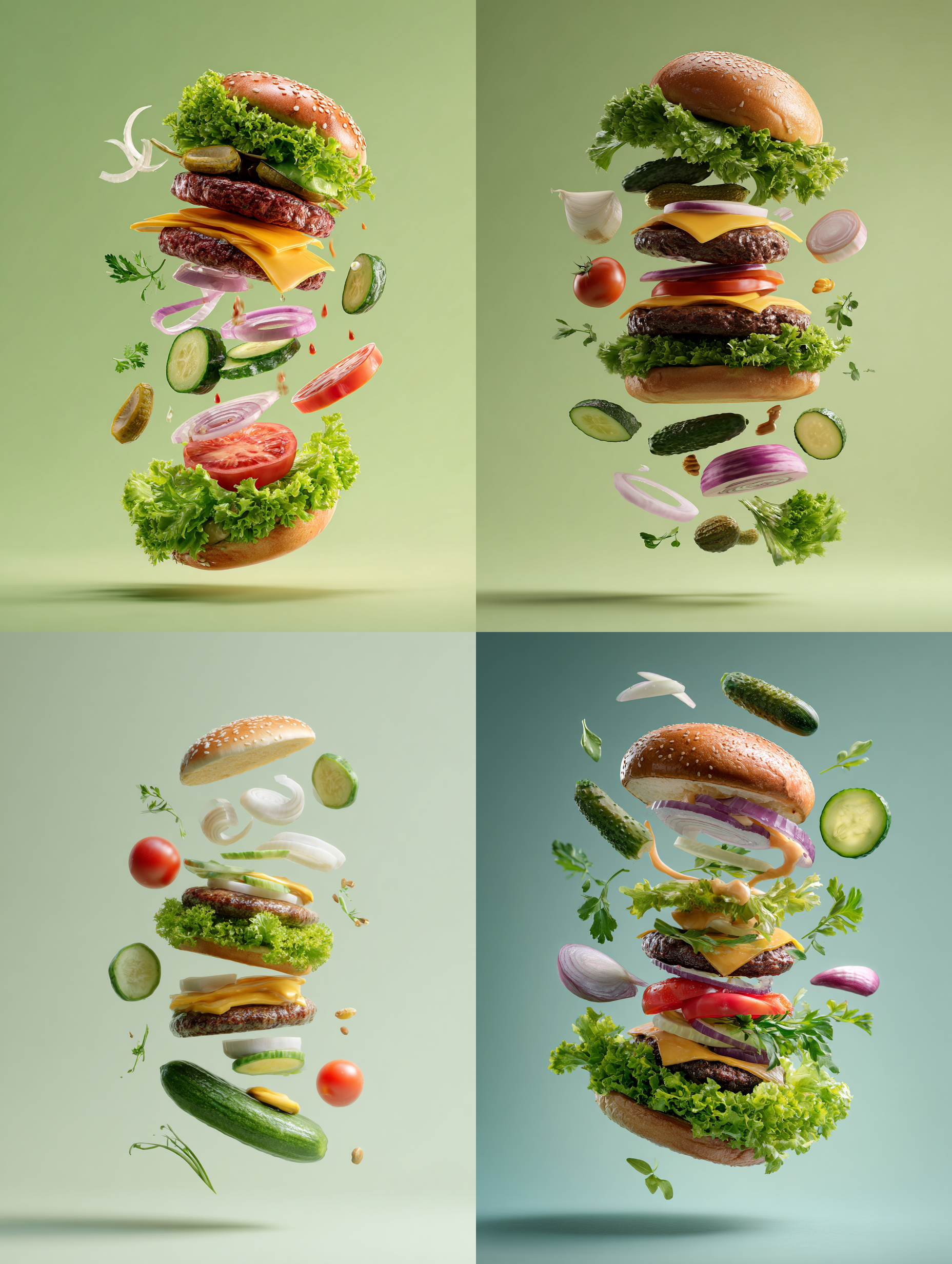 bun, tomato, meat patties, sauce, cheese, lettuce leaves, cucumbers, onions, flying in the air and folded into a whole burger, minimalistic light green backdrop photo