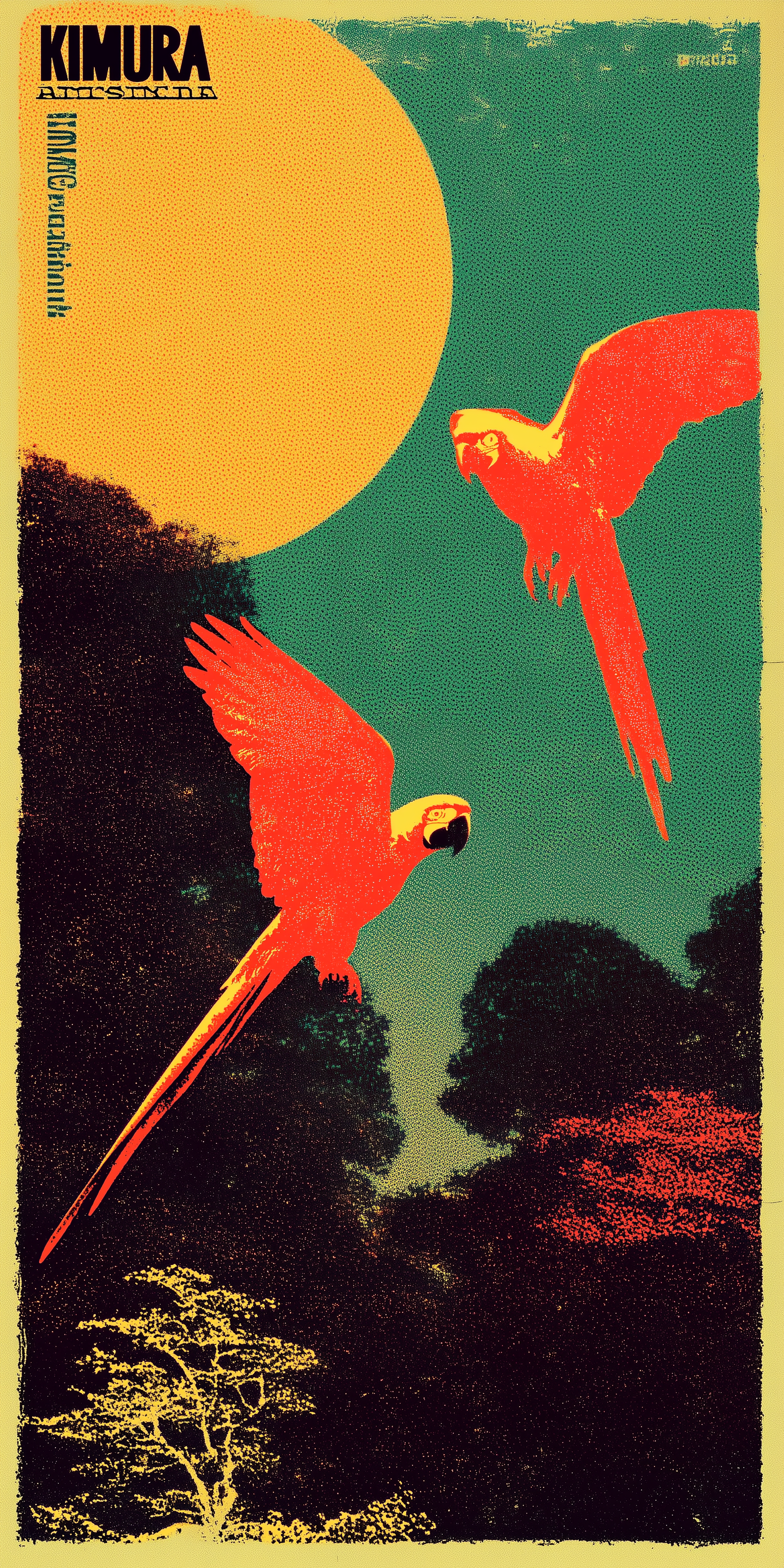 1960's vintage national park poster, letterpress, risograph, black light, bright colors featuring two macaws and the text "KIMURA"