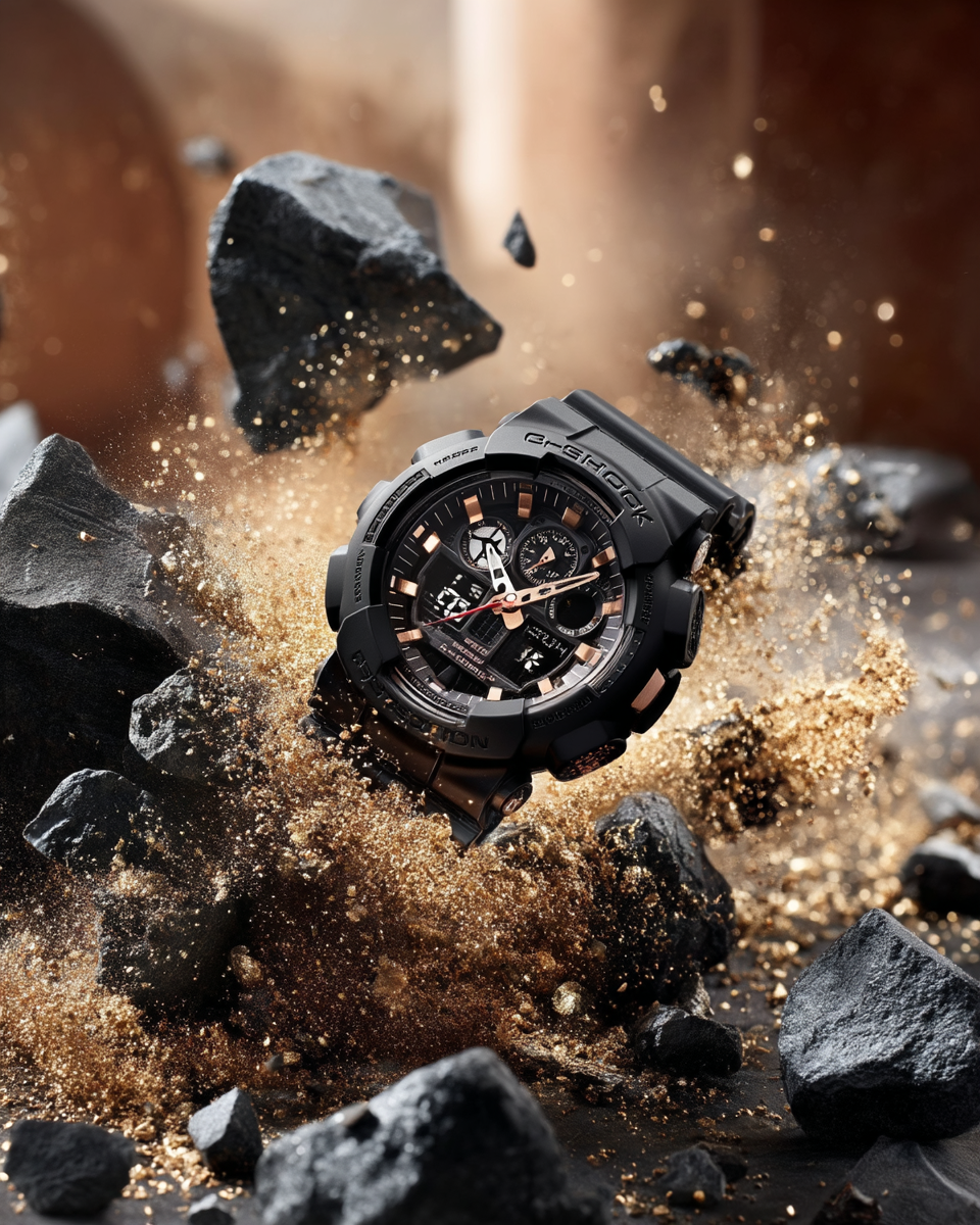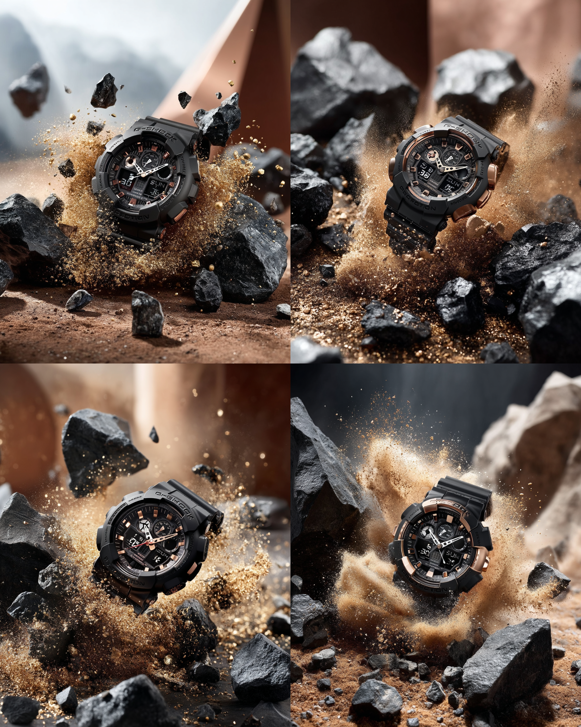Casio G-SHOCK GA-100-1A1 watch in dramatic explosion of shattered black rocks, golden dust clouds, warm earthy background, cinematic lighting, ultra-detailed macro shot, dynamic angle, high contrast, premium product photography --ar 4:5 --raw --sref https://s.mj.run/9oASJW5q-ic --profile geisree --oref https://s.mj.run/L9l3jYM5Sd0 --v 7