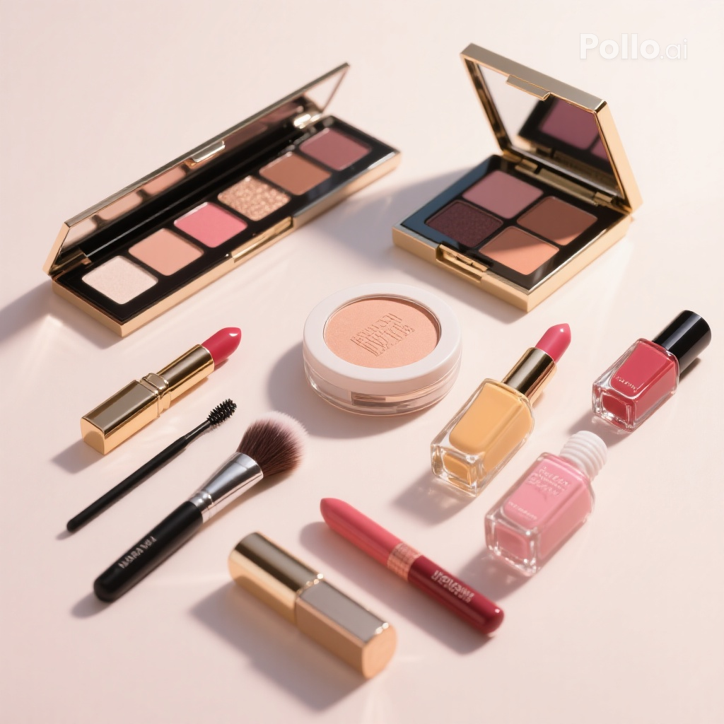 眼影盘、刷子、粉饼、指甲油和护肤品瓶。产品应该看起来时尚、优雅、色彩丰富,带有一丝奢华和光芒。灯光应该明亮且美观,非常适合美容广告。