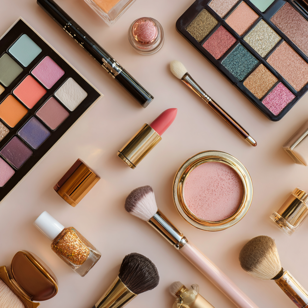 eyeshadow palettes, brushes, compact powder, nail polish, and skincare bottles. The products should look stylish, elegant, and colorful, with a touch of luxury and glow. Lighting should be bright and aesthetic, perfect for a beauty advertisement.