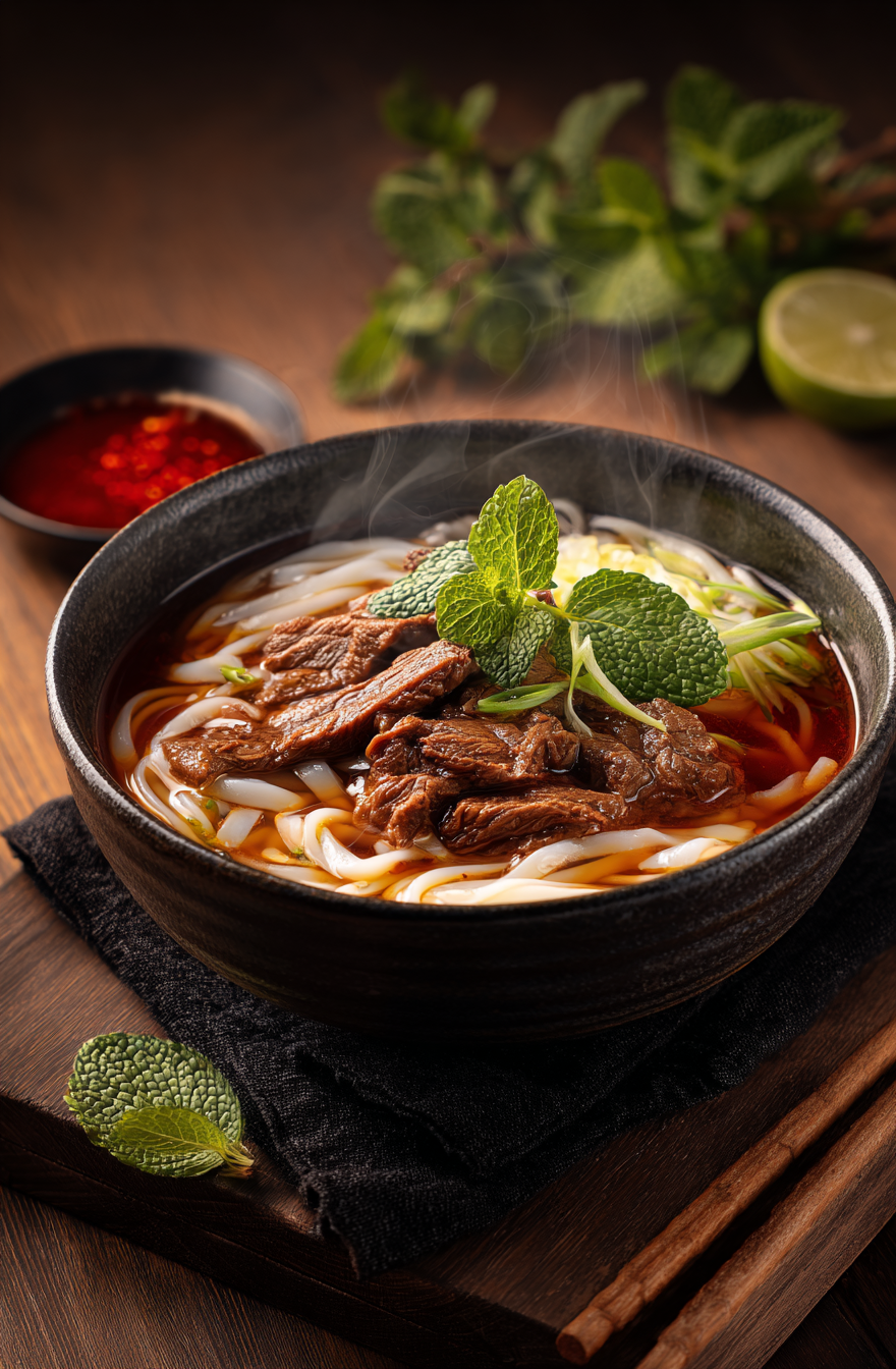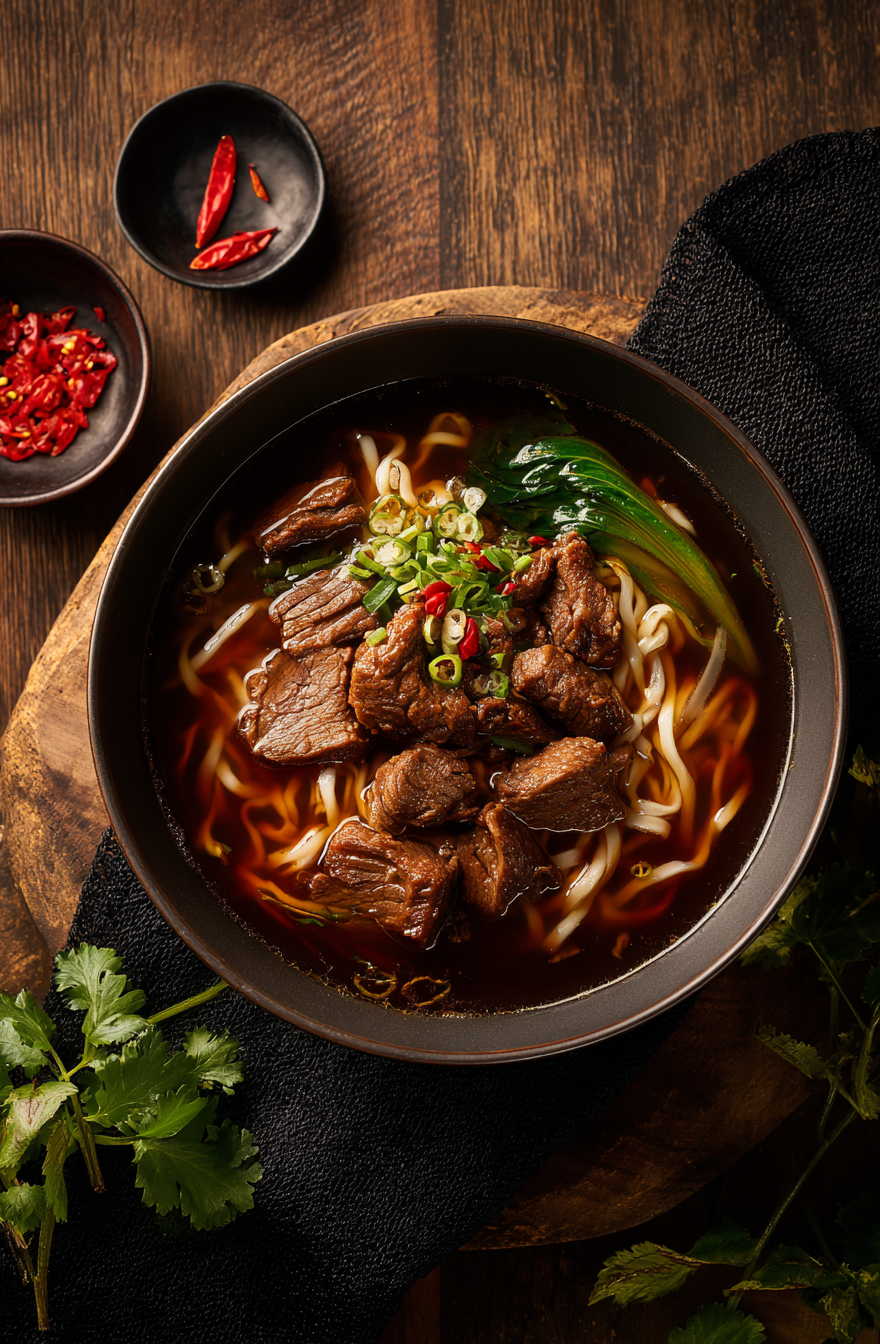 a bowl of beef noodles, placed on a wooden table with a black cloth and some herbs around it. there is red oil in the top left corner of the image. this is a food photography image in a commercial advertising style, with a top-down angle, warm color tone, studio lighting, and a dark background. the photography is high-resolution, with super-detailed, super-realistic, 3d-rendered, 8k quality. --ar 21:32