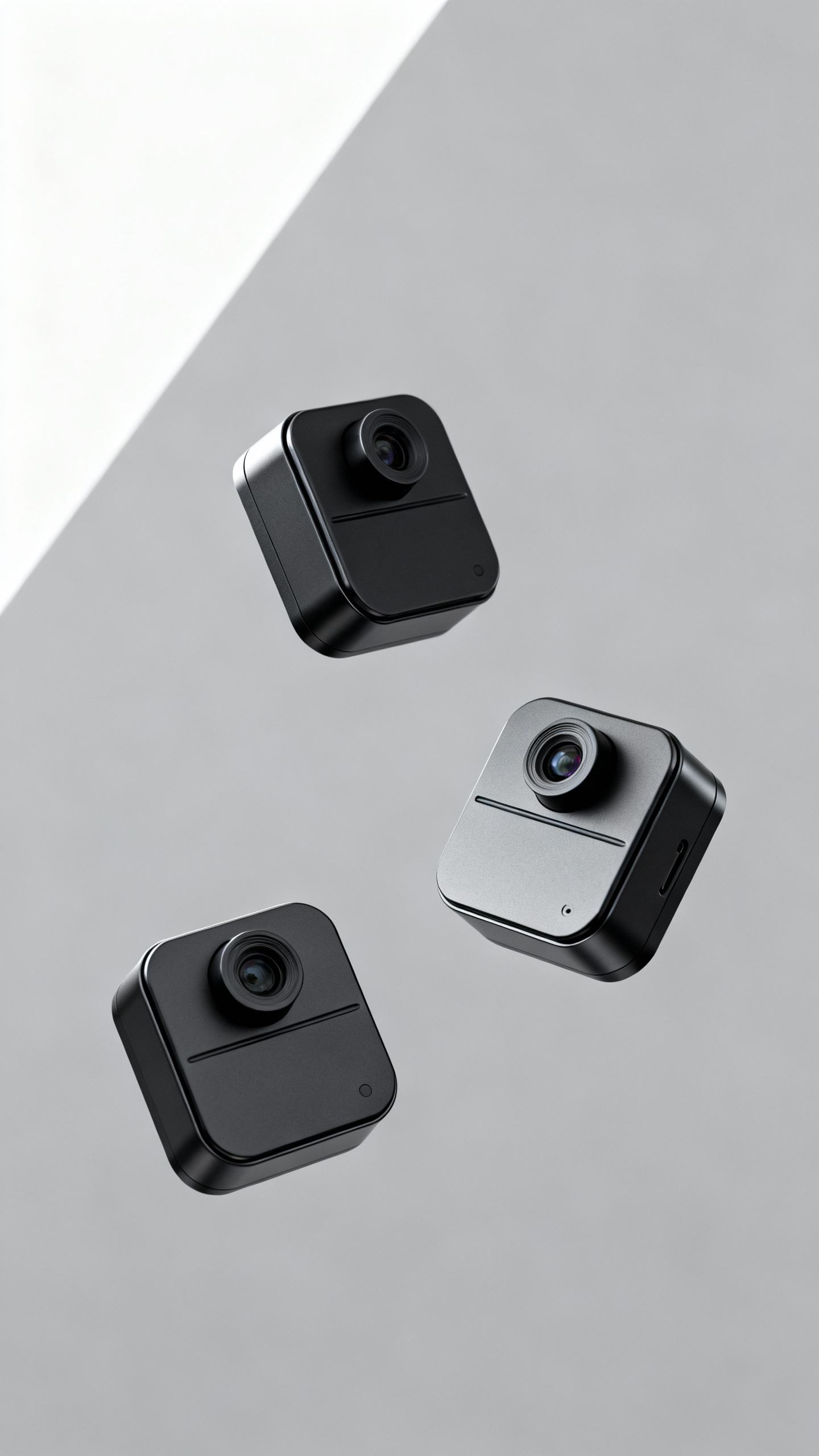 floating in the air, with a gray background and white space in the top left corner, designed in the style of dieter rams. product photography. the camera is black, square-shaped, with curved edges, a small lens, a high-tech feel, a metallic texture, and soft lighting. high resolution. ultra-realistic detail rendering. high-quality, clean, and simple design.