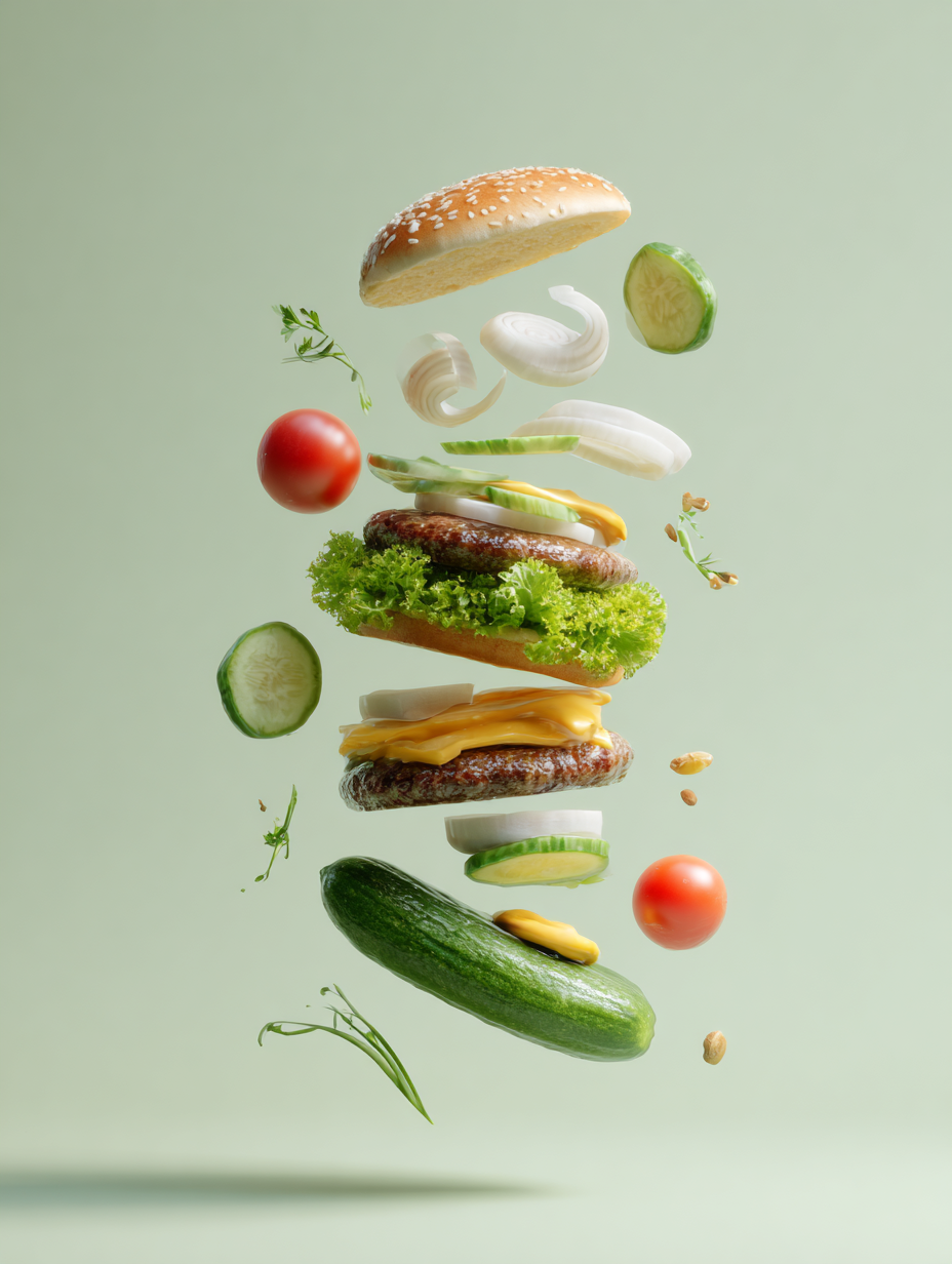 bun, tomato, meat patties, sauce, cheese, lettuce leaves, cucumbers, onions, flying in the air and folded into a whole burger, minimalistic light green backdrop photo