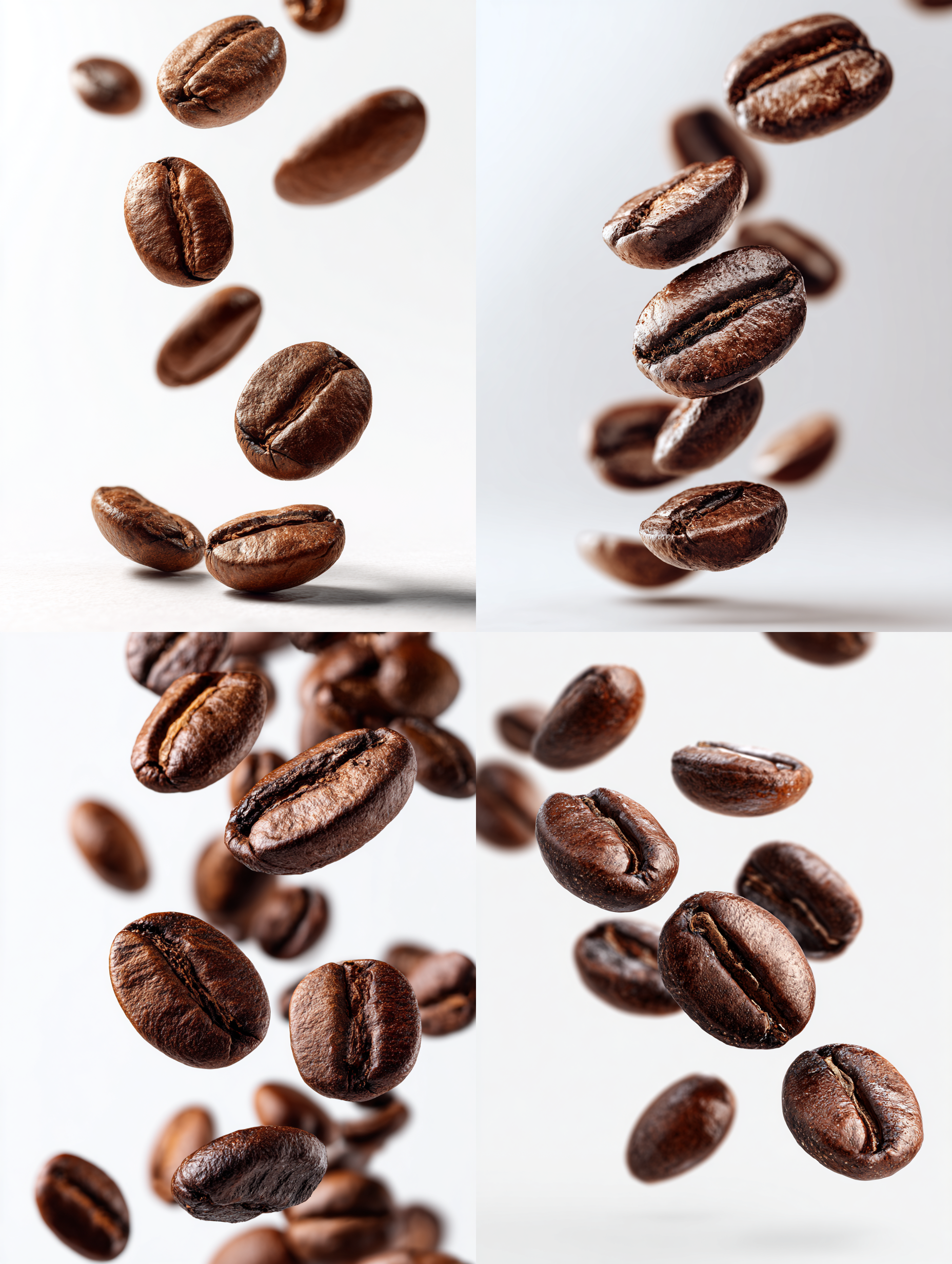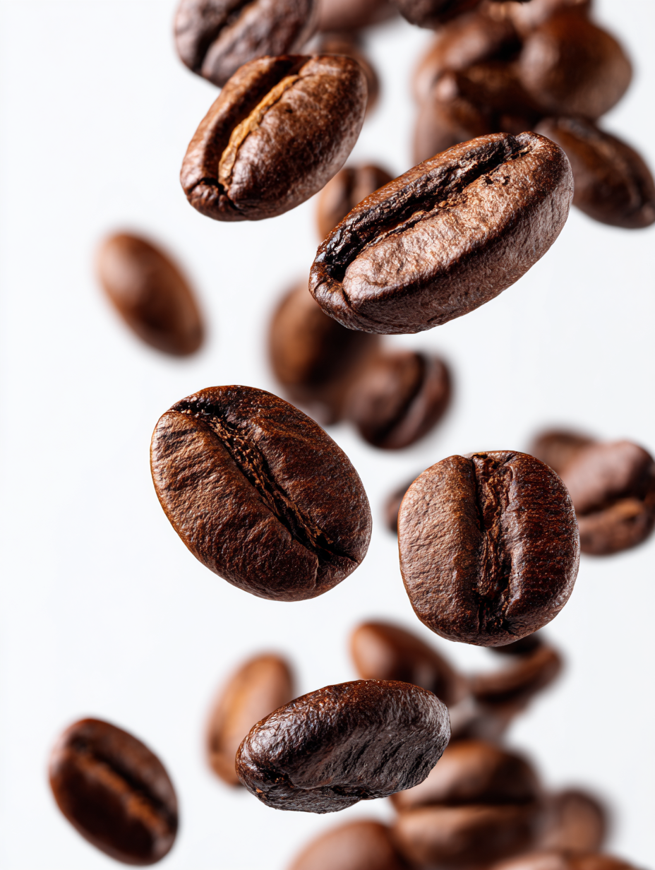 minimalist photograph of coffee beans flying dramatically in the air against a white backgroundminimalist photograph of coffee beans flying dramatically in the air against a white background