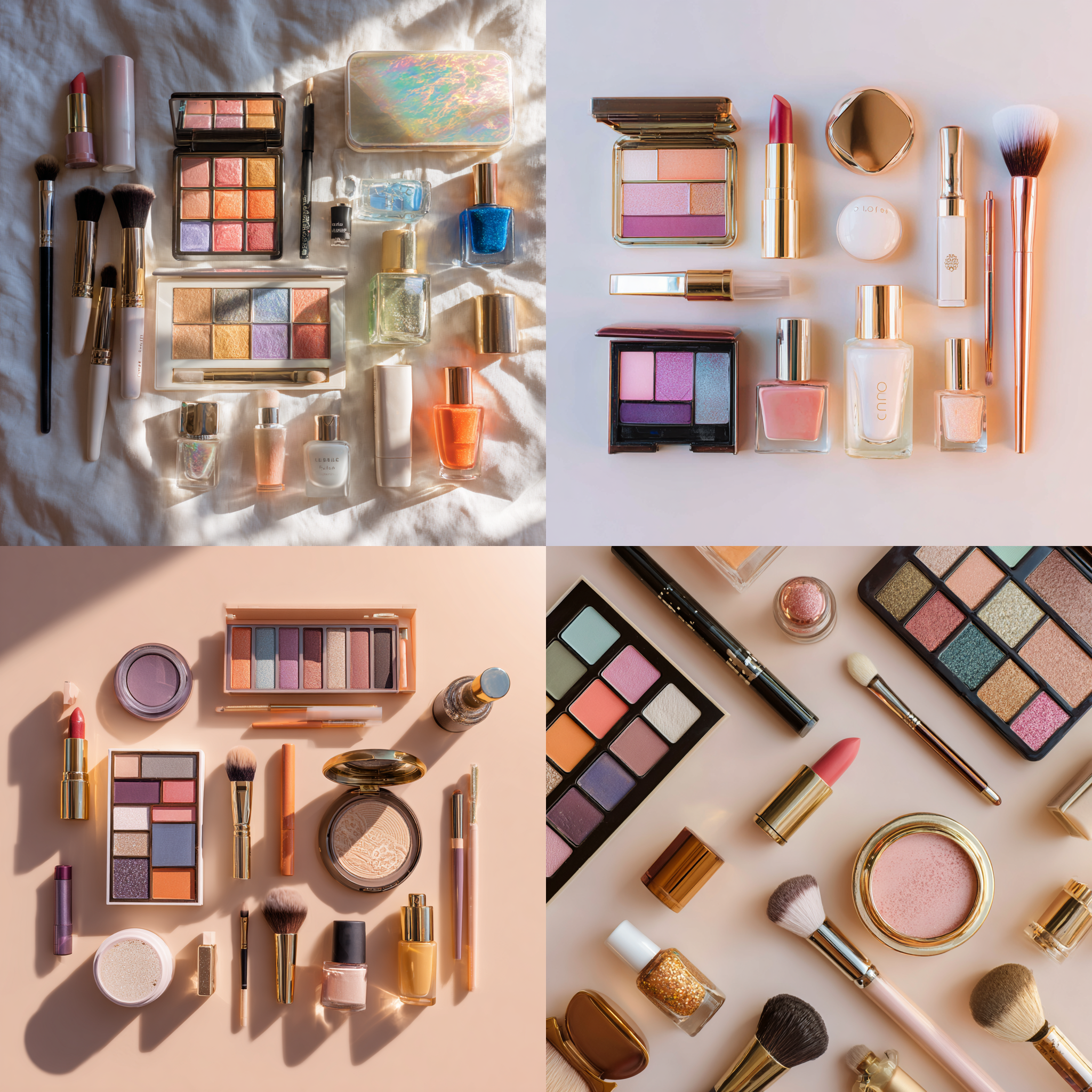 眼影盘、刷子、粉饼、指甲油和护肤品瓶。产品应该看起来时尚、优雅、色彩丰富,带有一丝奢华和光芒。灯光应该明亮且美观,非常适合美容广告。