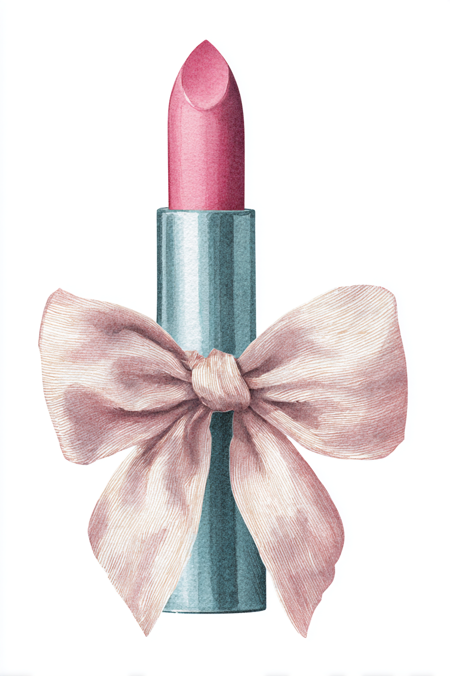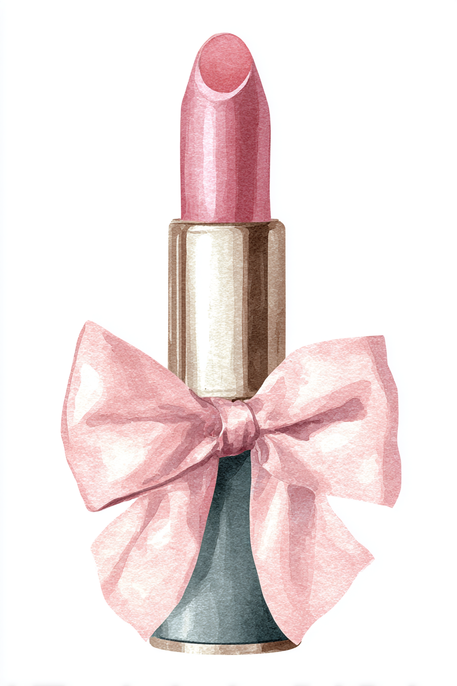 a vintage lipstick with a silk bow, watercolor illustration, delicate pastel colors, dreamy style, isolated on white background