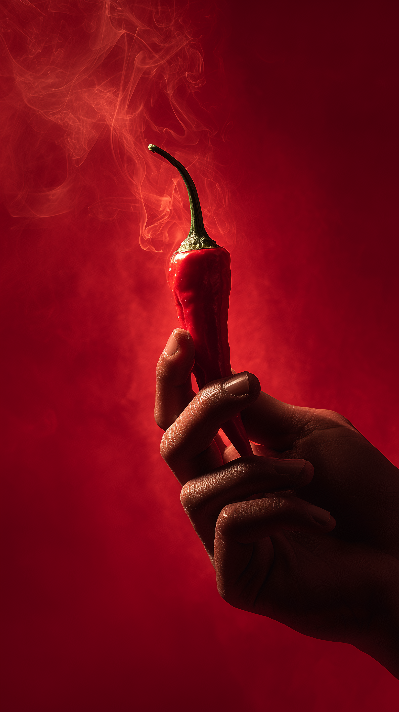 金棕色的马铃薯块、充满活力的红辣椒片和微小的绿色葱段迅速层叠并堆积在一碗热气腾腾的即食外卖米饭上,以高速动态帧捕捉,运动模糊暗示着速度和能量,食材闪烁着新鲜感和浅油光泽,温暖的食物色调和饱和的深红色背景之间强烈的色彩对比,逼真的8K细节,垂直的快餐包装构图